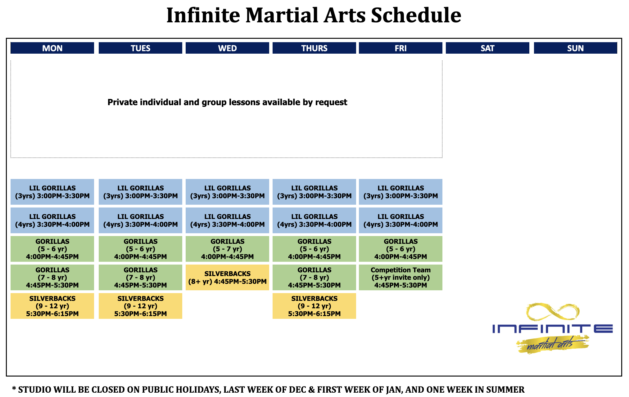 There are no kids’ classes on weekends. There are no other classes than the ones listed in the schedule above.